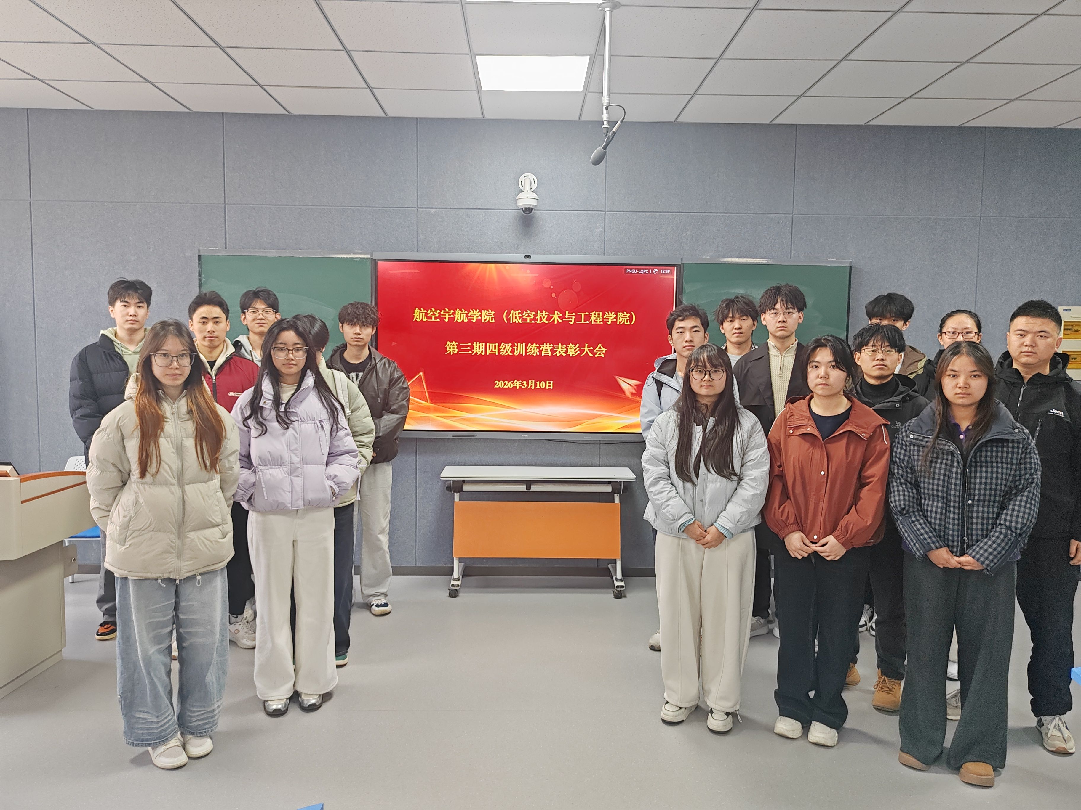 为进一步加强学风建设,总结英语四级备考培训成果,表彰在四级考试与训练营学习中表现突出的优秀学生,航空宇航学院(低空技术与工程学院)于3月10日在阎良校区2201室召开第三期英语四级训练营表彰大会。党委副书记刘雨辰、学工办主任杜阳宇、四级训练营负责人张鹏杰、各年级辅导员及训练营全体学员共同参加本次大会。